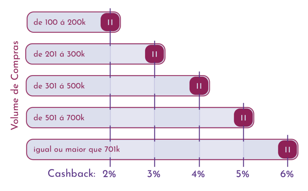 Cada fase de volume de compras desbloqueia um novo nível de cashback, permitindo que você maximize suas vantagens e ganhe mais.